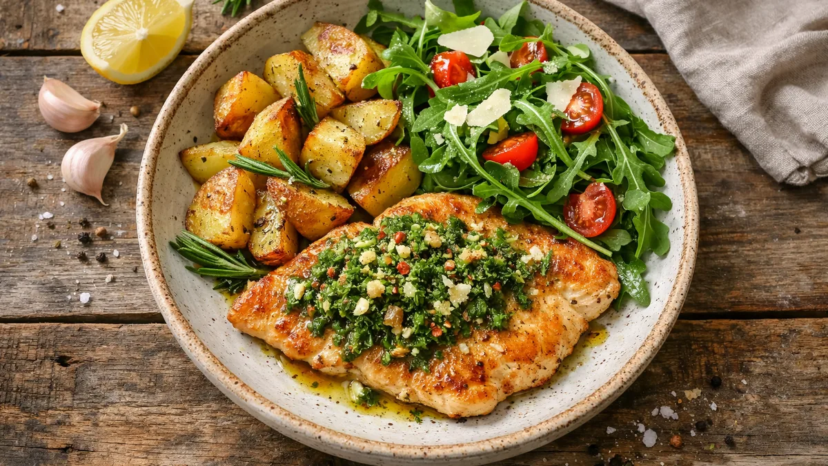 with Herb Gremolata, Rosemary Potatoes, and Arugula Salad