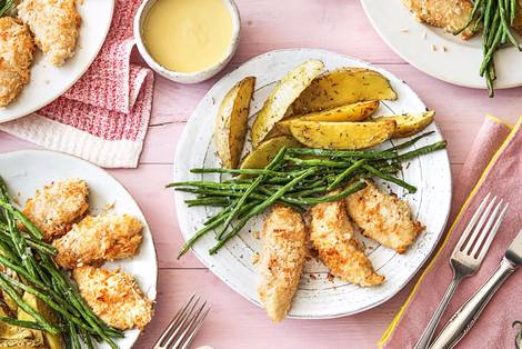 with Rosemary Fries, Green Beans, and Honey Mustard Sauce
