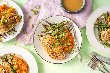 with Sweet Potato Mash and Almond Green Beans