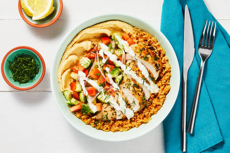 with Hummus, Tomato Cucumber Salad & Feta Sauce
