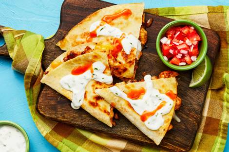 with Chicken Thighs, Spicy Guacamole & Smoky Red Pepper Crema