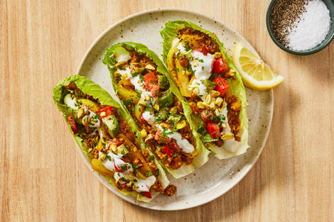 with Israeli Salad, Pistachios & Lemon Garlic Yogurt Sauce