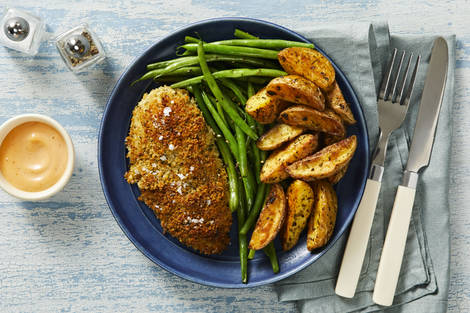 with Buttery Green Beans, Potato Wedges, and Spicy Mayo