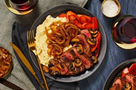 with Caramelized Onion Mashed Potatoes and Roasted Carrots