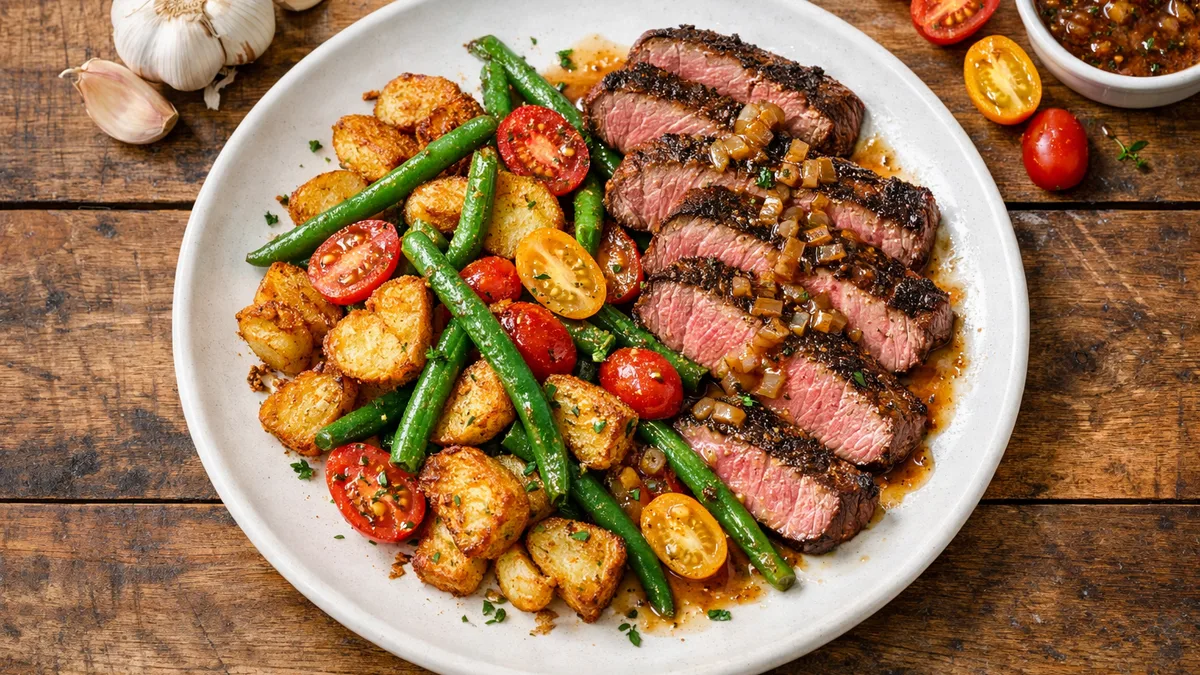 with Roasted Sweet Potatoes, Green Beans, and Citrus Sour Cream