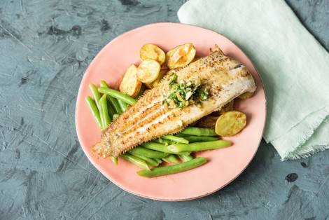 with Salsa Verde, Fingerling Potatoes, and Lemony Green Beans