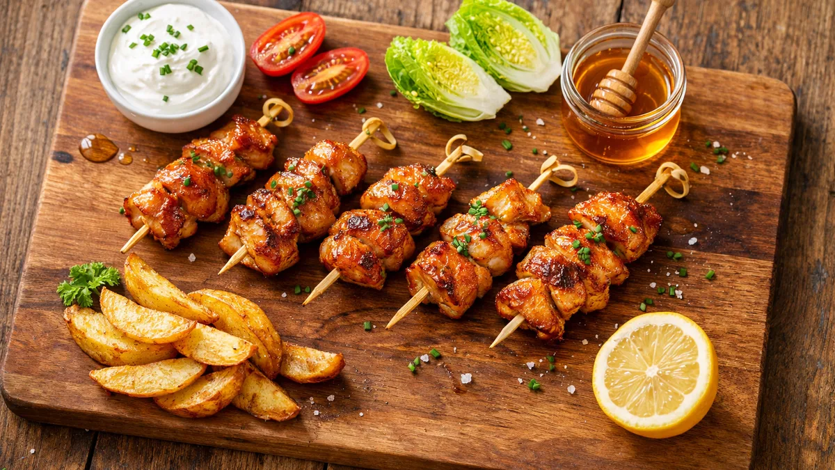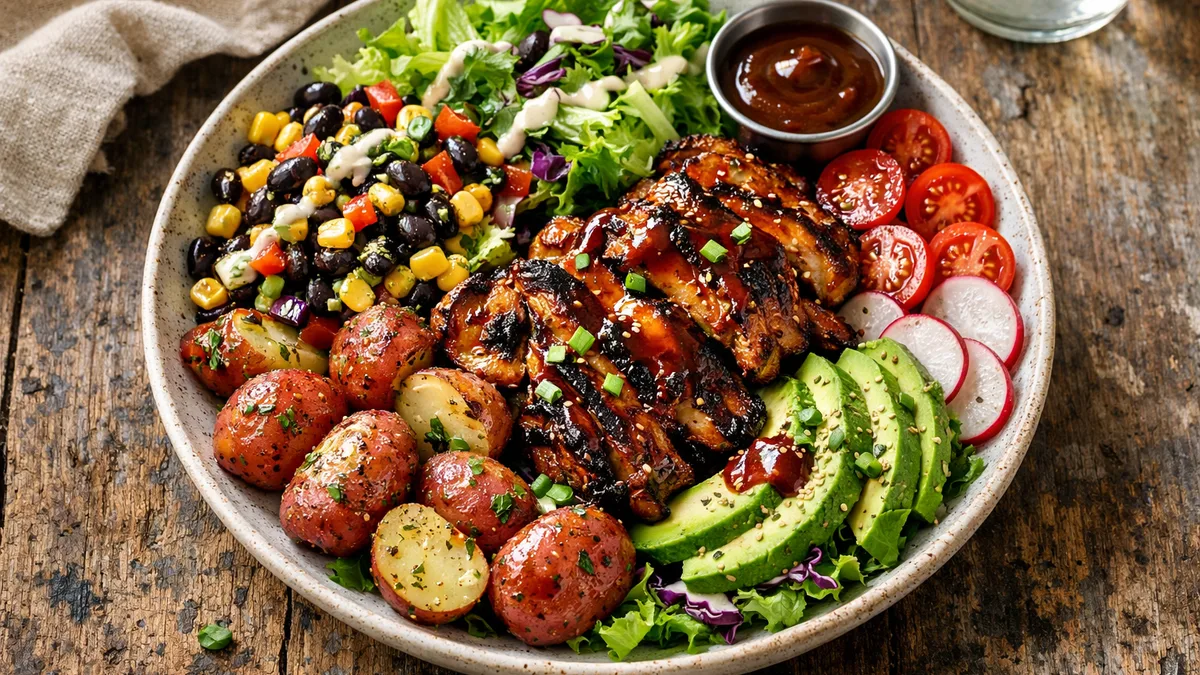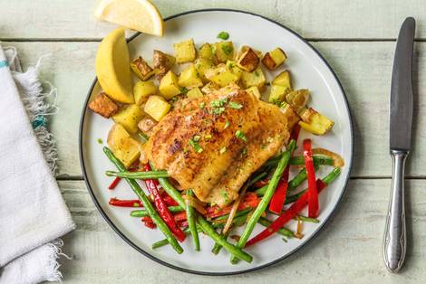 with Sweet Potato Wedges and Warm Tomatoes in Vinaigrette