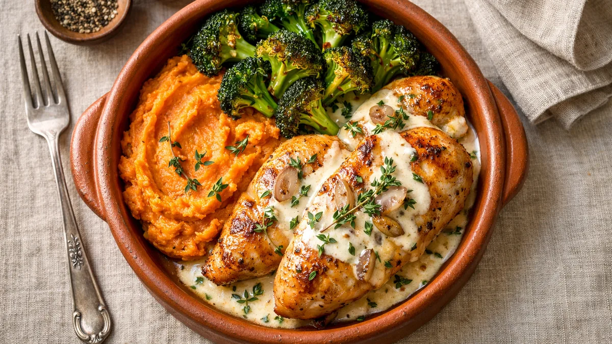 with Creamy Thyme Sauce, Mashed Sweet Potato, and Roasted Broccoli