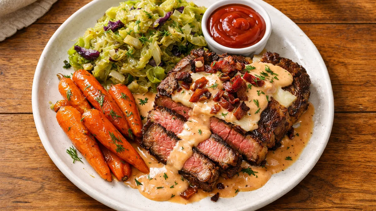 with Tangy Braised Cabbage and Russian Dressing Pan Sauce