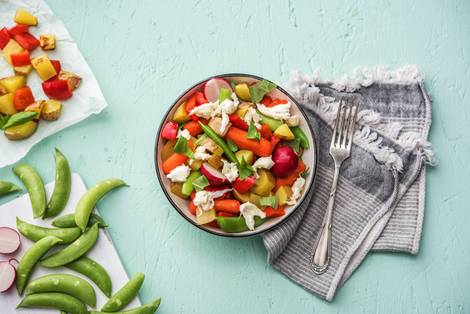 with Radishes, Snap Peas, Pesto, and Mozzarella