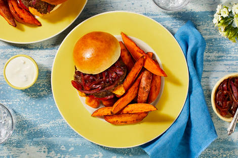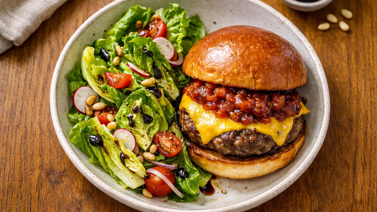 with Tomato-Onion Jam and Baby Gem Lettuce Salad