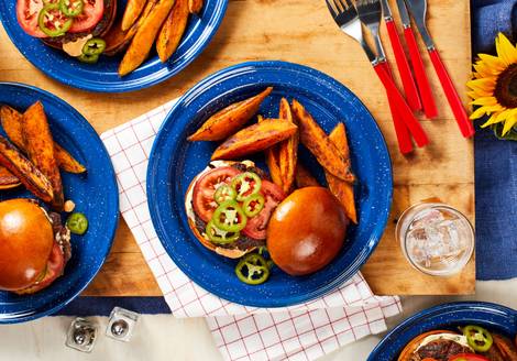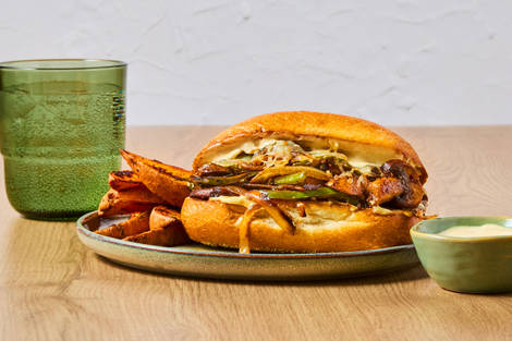 with Dijon Mayo & Seasoned Sweet Potato Wedges