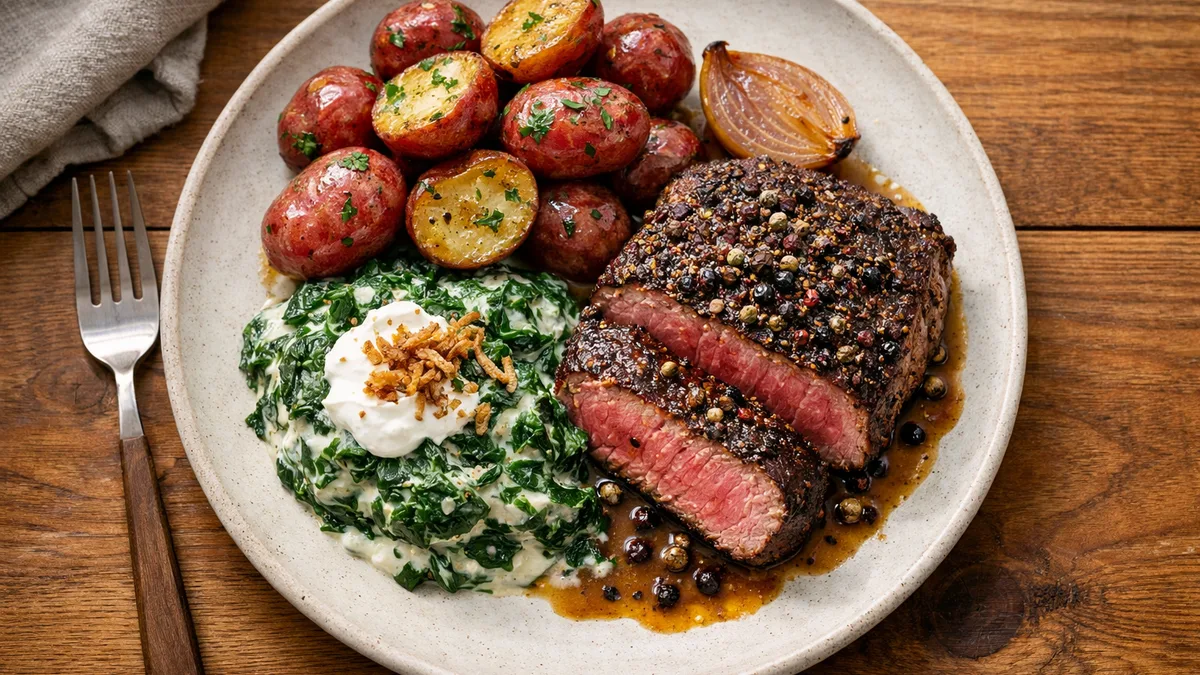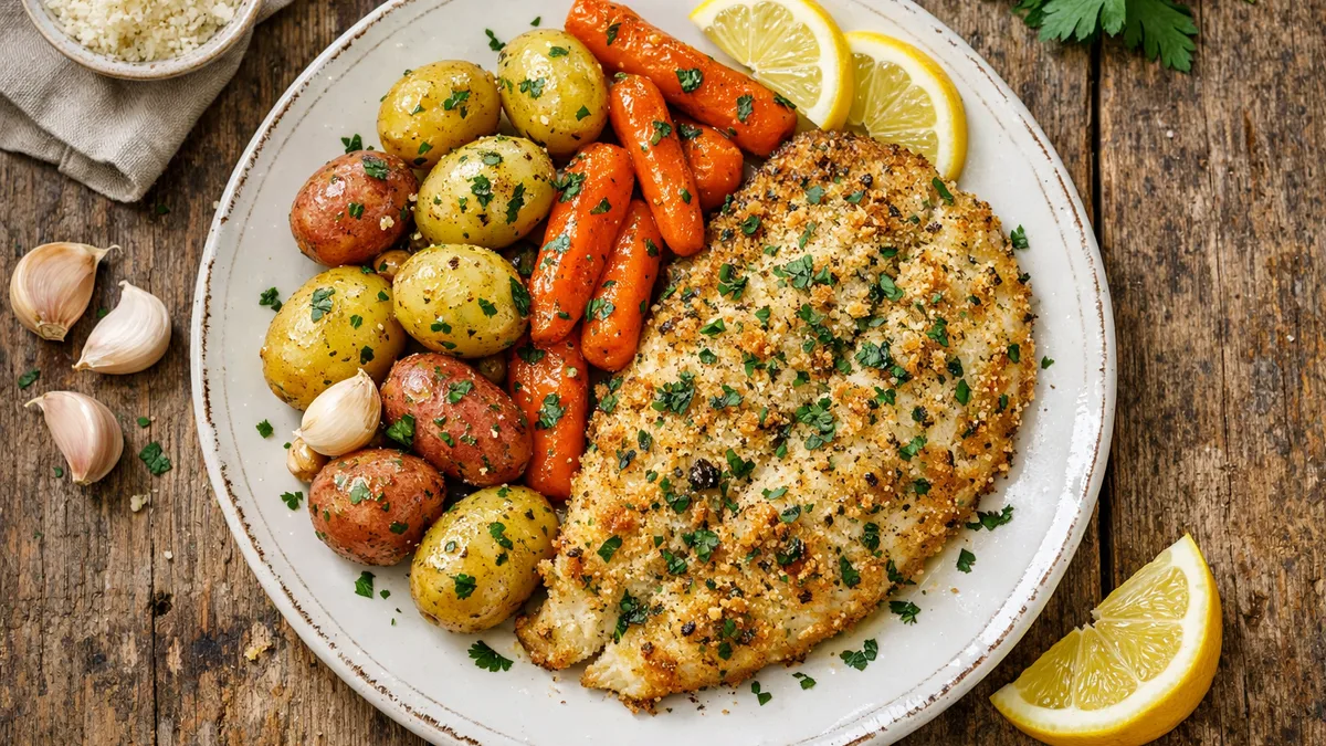with Roasted Baby Carrots and Caramelized Onion Mashed Potatoes
