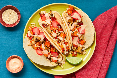 with Mushrooms, Pickled Radishes, Creamy Sriracha Sauce & Fried Onions