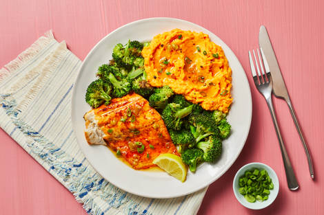 plus a side of Mashed Sweet Potatoes & Roasted Broccoli