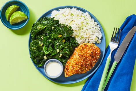 with Garlicky Kale, Ginger-Lime Rice & Creamy Wasabi Sauce
