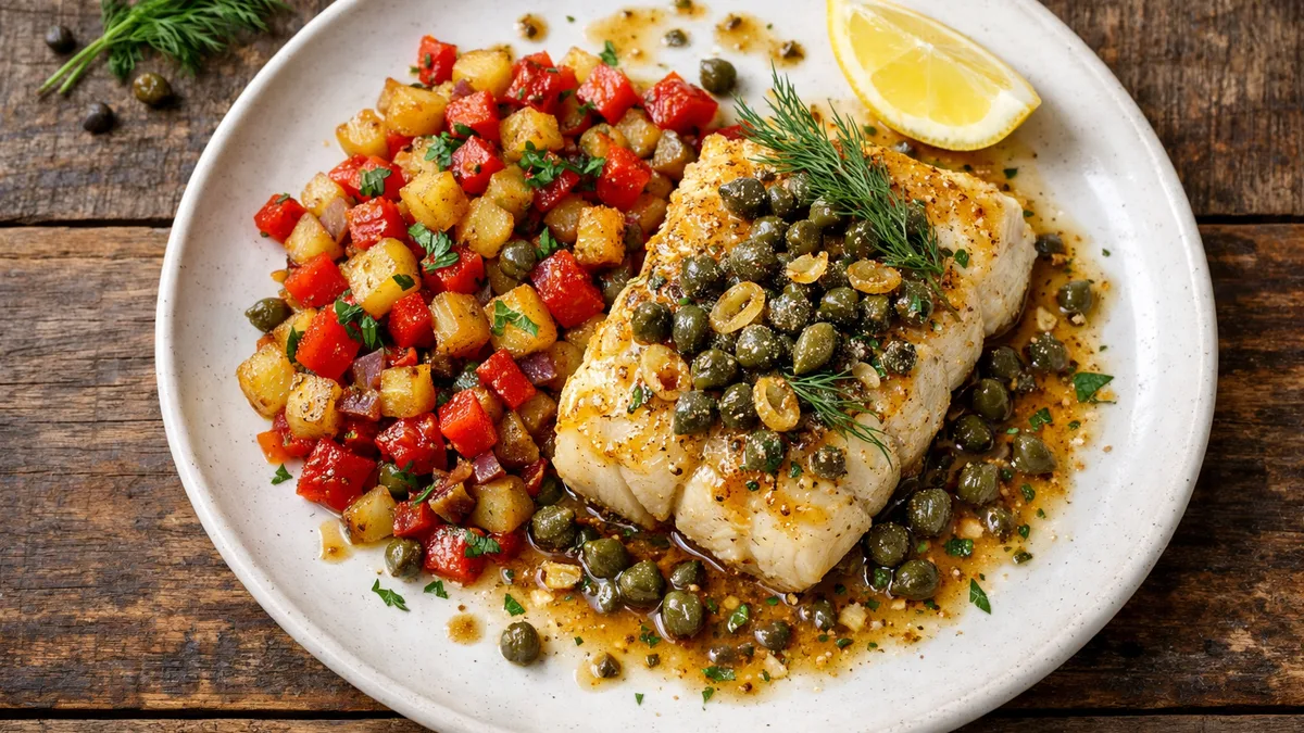 with Brown Butter Caper-Sauce, Dill, and Red Pepper-Potato Hash