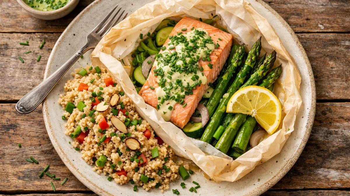with Whole Wheat Couscous Pilaf, Asparagus, and Tarragon-Chive Herb Sauce