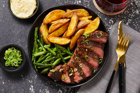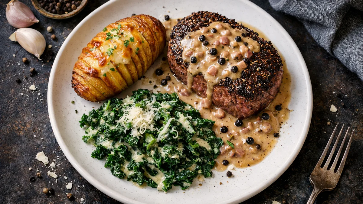 Steak Au Poivre with Cheesy Hesselbeck Potatoes, Creamed Kale, and Shallot-Peppercorn Sauce