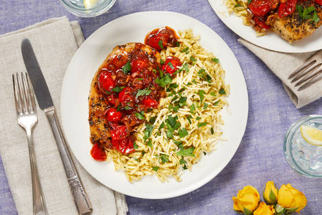 with Burst Tomatoes and Cheesy Pesto Orzo