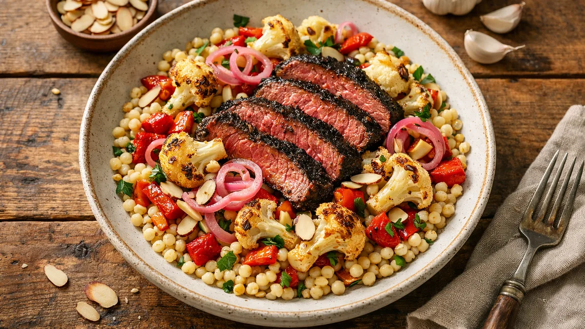 with Israeli Couscous, Pickled Shallots, and Roasted Red Pepper