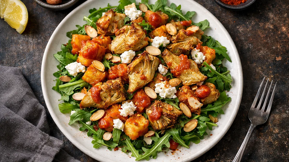 with Roasted Chickpeas, Harissa Hummus & Cucumber Feta Salad