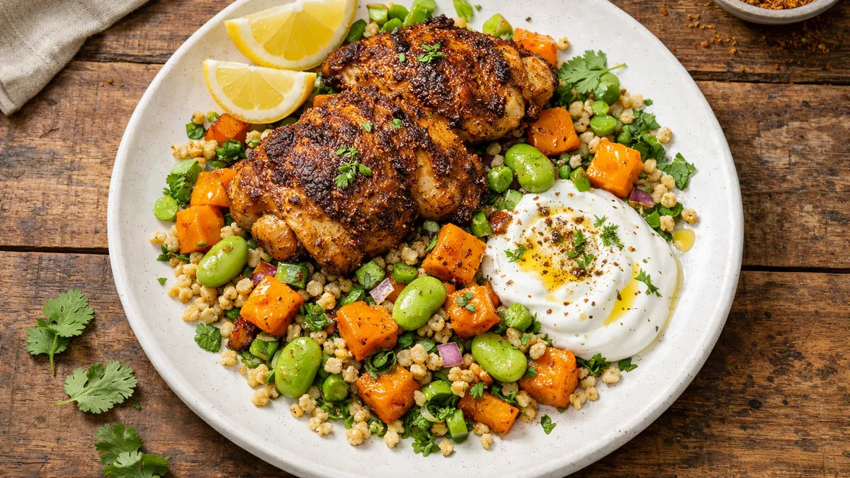 with Couscous, Carrots, and Harissa Crema