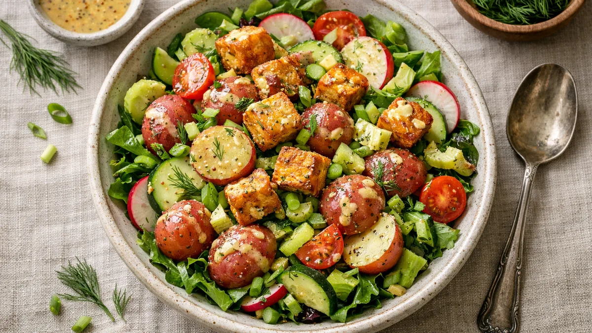 with Crispy Tofu, Dill & Tangy Dijon Dressing