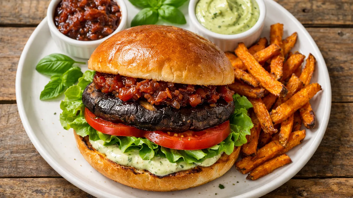 with Sweet Potato Fries, Tomato-Onion Jam & Basil Aioli