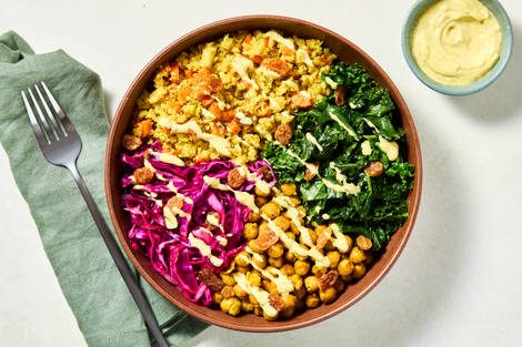 with Turmeric Couscous, Roasted Veggie Medley, & Garlicky White Sauce