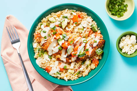 with Roasted Chickpeas, Harissa Hummus & Cucumber Feta Salad