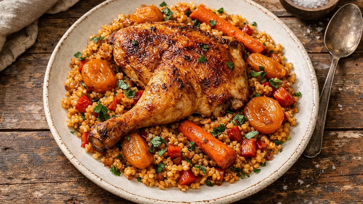 with Bulgur Paella, Carrots, and Apricots
