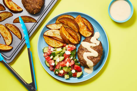 with Tomato Salad, Hummus Sauce & Potato Wedges