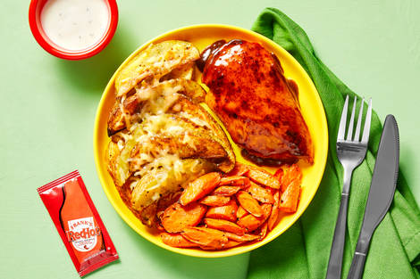 with Roasted Carrots & Cheesy Garlic Potato Wedges