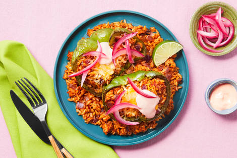 with Cauliflower Rice, Smoky Red Pepper Crema & Pickled Red Onion