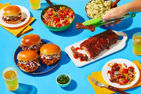 with Creamy Slaw, Herby Dijon Potato Salad & Basil Ranch Charred Corn Salad