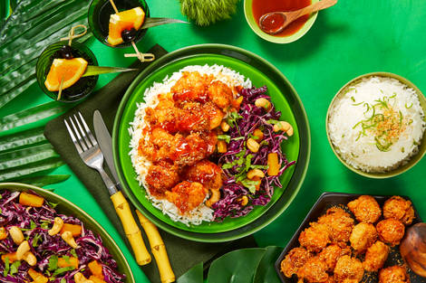 with Tropical Slaw, Lime Rice & Sweet ’n’ Spicy Sauce