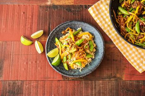 with Snap Peas and Yellow Bell Pepper over Brown Rice