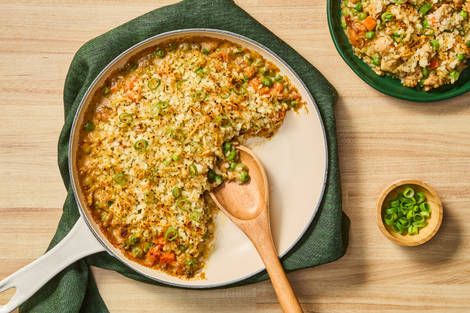 with Chicken Thighs, Peas & Cauliflower-Parm Topping