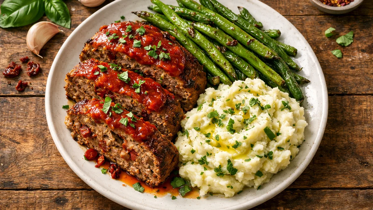 with Sundried Tomatoes, Roasted Green Beans, and Garlic-Basil Mashed Potatoes