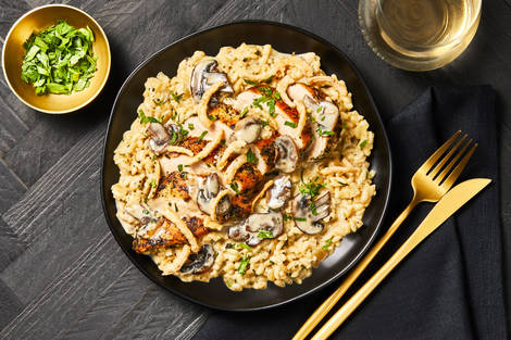 with Creamy Mushroom Sauce & Crispy Onions
