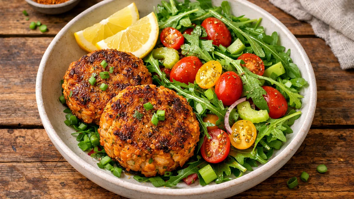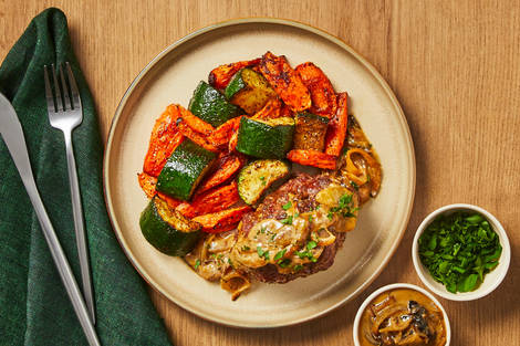 with Cauliflower “Rice” Fritters, Zucchini & Creamy Mushroom Sauce