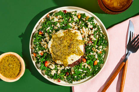 cauliflower “rice” with kale, almonds, sunflower basil sauce