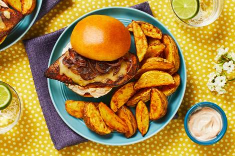 with Avocado, Caramelized Onions, and Spicy Mayo