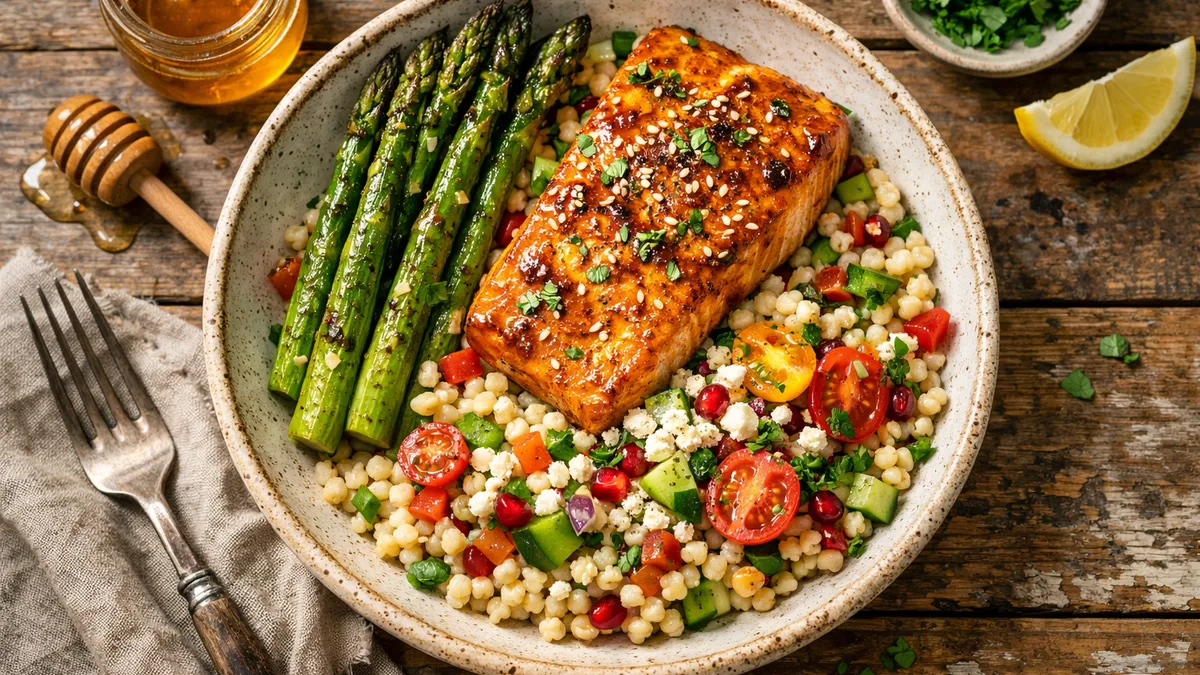 with Roasted Asparagus and Israeli Couscous Pilaf