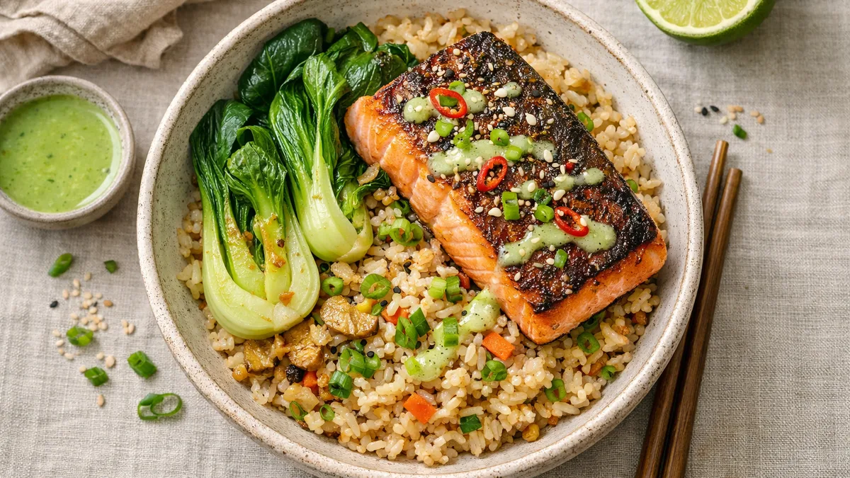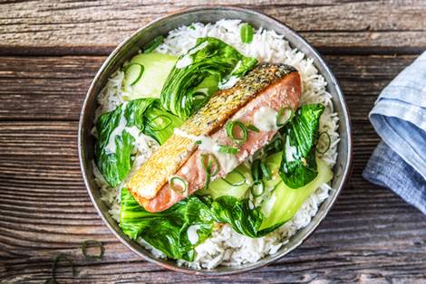 with Bok Choy, Wasabi Lime Dressing, and Soy-Infused Rice