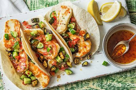 with Roasted Zucchini, Cucumber Tomato Salad, and Chili Honey Oil