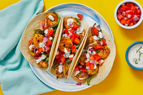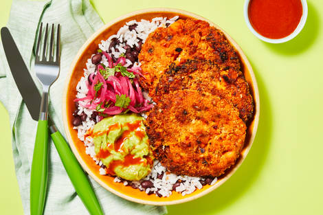 with Lime-Pickled Onion, Guacamole, Rice & Beans