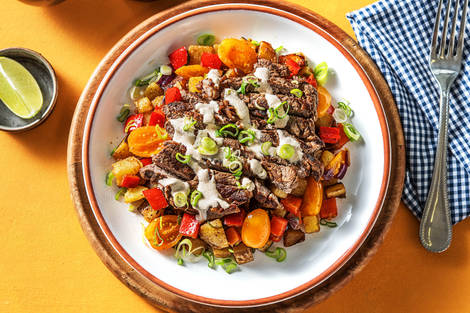 with Roasted Veggies, Chickpeas, Pickled Onion & Harissa Yogurt Sauce