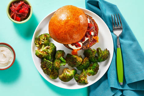 with Tomato Onion Jam and Roasted Broccoli